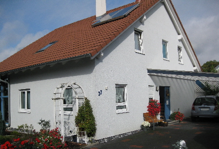 Hausansicht “Das Haus am Weinberg” mit Parkplätzen vor dem Haus.