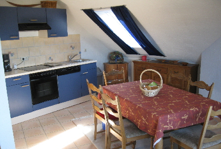 Die an den Wohnbereich angrenzende offene Einbauküche ist mit Elektroherd, integriertem Backofen, Geschirrspüler und Kaffeemaschine voll eingerichtet. Ein Tisch mit sechs Sitzplätzen bietet für Sie und ihre Familie ausreichend Platz.