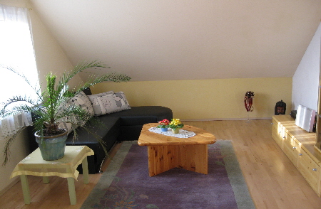 U n s e r e F e r i e n w o h n u n g Die helle 60 qm große 2 1/2 Zimmer-Wohnung besteht aus dem großzügigem Wohnbereich, angrenzender offener Einbauküche mit Essecke. Das Bad mit Dusche/ WC und das Schlafzimmer befinden sich separat ebenfalls auf der gleichen Wohnebene. Die Wohnung im Obergeschoss des Hauses ist voll möbliert und mit Sat-TV und Telefon für Ihre Bedürfnisse eingerichtet. Vom Balkon aus bietet sich Ihnen ein toller unverbauter Ausblick auf die angrenzenden Obstwiesen und Weinberge.